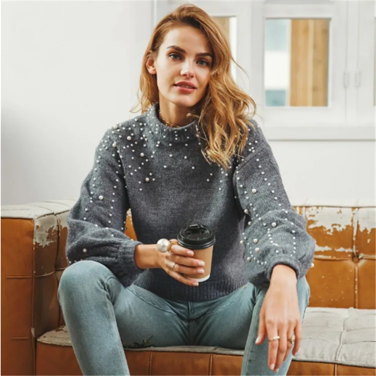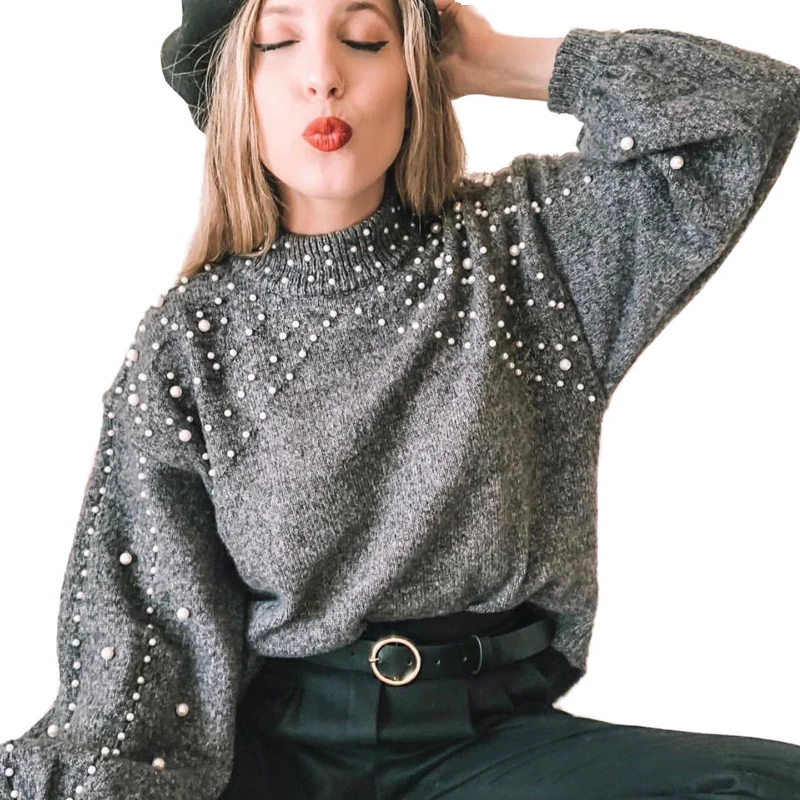 New Solid Color Cable Knit Pullover Sweater for Women Long Length Casual Print Pearls Decoration Knitted Coat Pullover